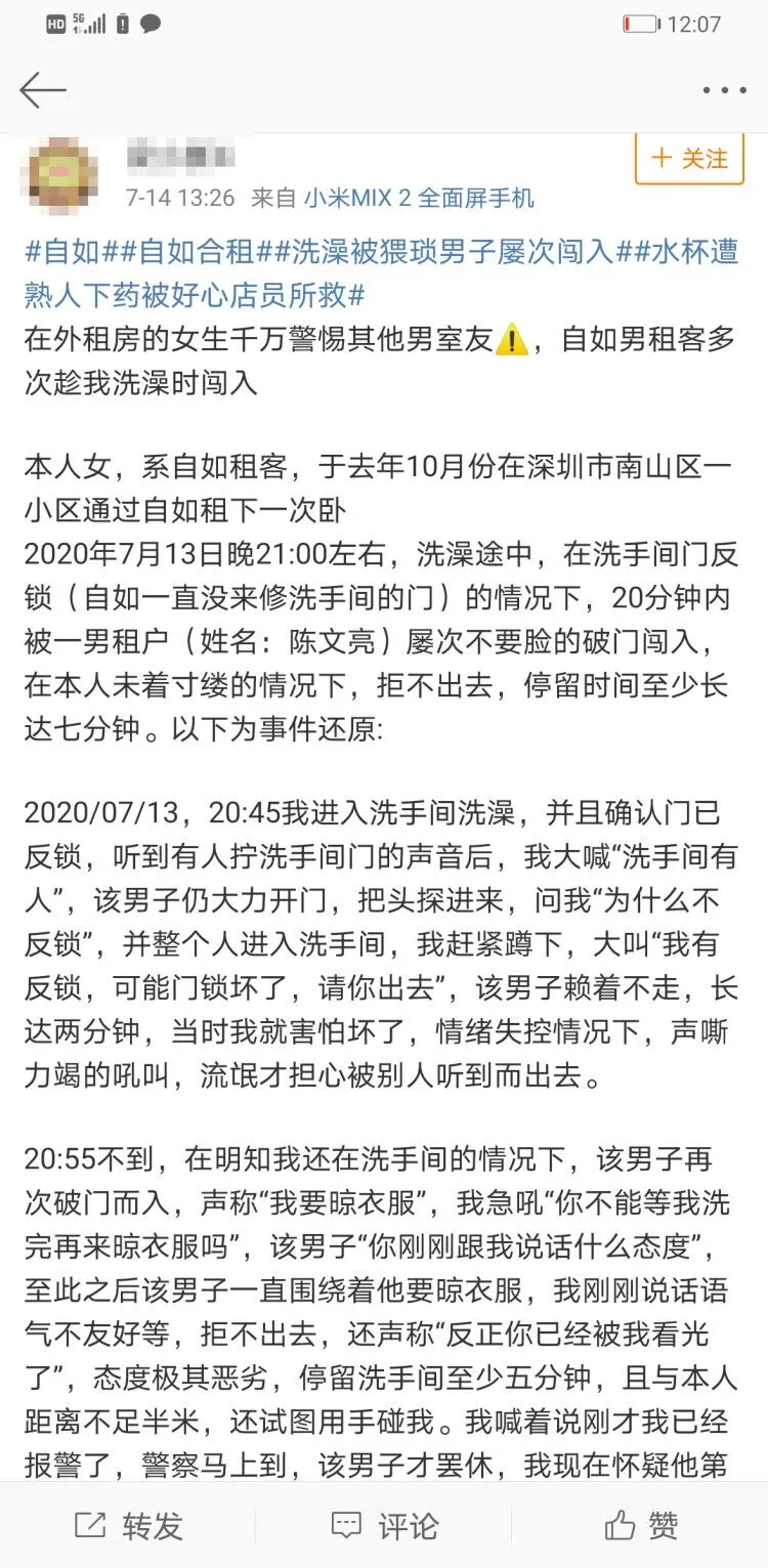 7月14日,梁女士在新浪微博發(fā)帖稱,她是南山某小區(qū)的自如租客,其在7月13日21時許的洗澡過程中,遭遇男性室友屢次闖入。根據(jù)梁女士描述,該男子態(tài)度惡劣,在梁女士未著寸縷的情況下在浴室停留時間長達(dá)數(shù)分鐘,其間還試圖伸手觸碰梁女士。梁女士回到房間后,向自如管家進(jìn)行反饋并報警。
