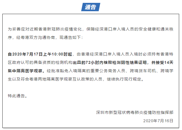 1、7月16日晚間,深圳市新型冠狀病毒肺炎疫情防控指揮部調(diào)整由香港經(jīng)深港口岸入境人員防控措施,由香港口岸入境人員須持72小時(shí)內(nèi)核酸檢測陰性結(jié)果證明,并接受14天集中隔離醫(yī)學(xué)觀察。