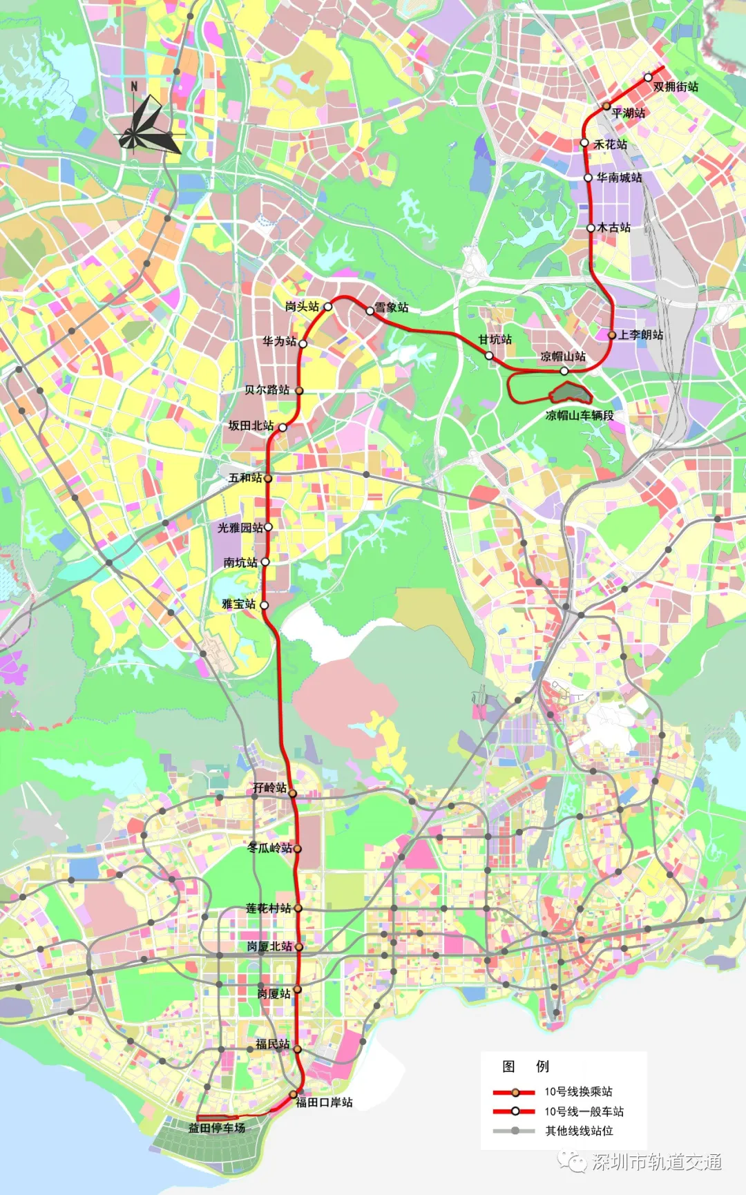 地鐵10號線起自福田區(qū)福田口岸站,終至龍崗區(qū)雙擁街站,途經(jīng)福田、龍華、龍崗3區(qū),線路全長約29km,采用全地下敷設方式,共設站24座(其中換乘站11座)。