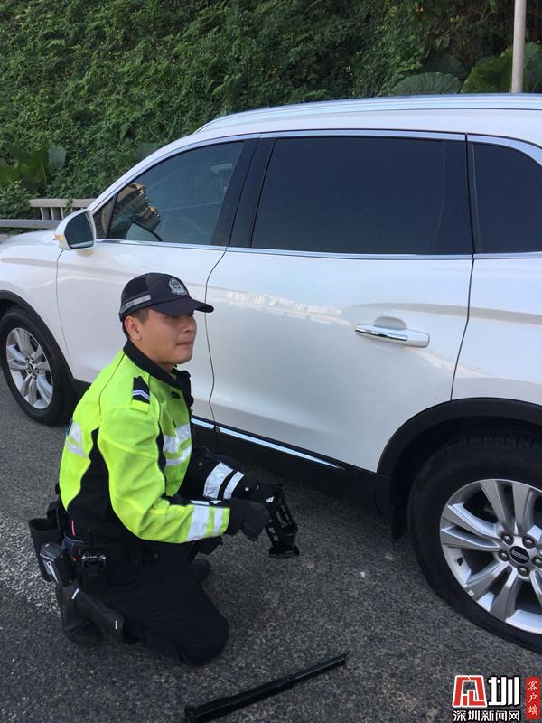 事情發(fā)生在10月11日早上10時(shí)30分許,劉先生駕車(chē)出外辦事,車(chē)輛行駛至東環(huán)高架西往東方向時(shí),突然一聲巨響左后輪輪胎爆裂車(chē)輛半路拋錨,當(dāng)時(shí)正值交通早高峰,過(guò)往車(chē)輛不斷,故障車(chē)輛停在道路中間導(dǎo)致路段交通擁堵,車(chē)主劉先生一時(shí)間不知所措,只能留在原地等待救援。此時(shí)正在執(zhí)行巡邏任務(wù)的羅湖交警鐵騎組長(zhǎng)陳展廷見(jiàn)狀,立即停下警車(chē)上前查看情況,了解情況后,為了緩解該路段的交通擁堵,防止出現(xiàn)交通意外,陳展廷立即讓劉先生把車(chē)??吭谧钣覀?cè)車(chē)道,然后安排隊(duì)員用警車(chē)在故障車(chē)輛周邊設(shè)置出了安全警戒區(qū)域,另一位隊(duì)員則對(duì)過(guò)往車(chē)輛進(jìn)行指揮疏導(dǎo)及勸慰駕駛?cè)瞬灰?,在安全區(qū)域等待,陳展廷則俯下身為爆胎車(chē)輛更換輪胎。約15分鐘的忙碌后,三位鐵騎隊(duì)員已滿(mǎn)身是汗,但在他們的密切協(xié)調(diào)配合下,快速幫助駕駛?cè)藙⑾壬鷶[脫困境,險(xiǎn)情在最短時(shí)間內(nèi)被及時(shí)排除,道路交通秩序也恢復(fù)正常,這暖心一幕讓劉先生很是感動(dòng),緊緊握著陳展廷同志的手連聲表示感謝。