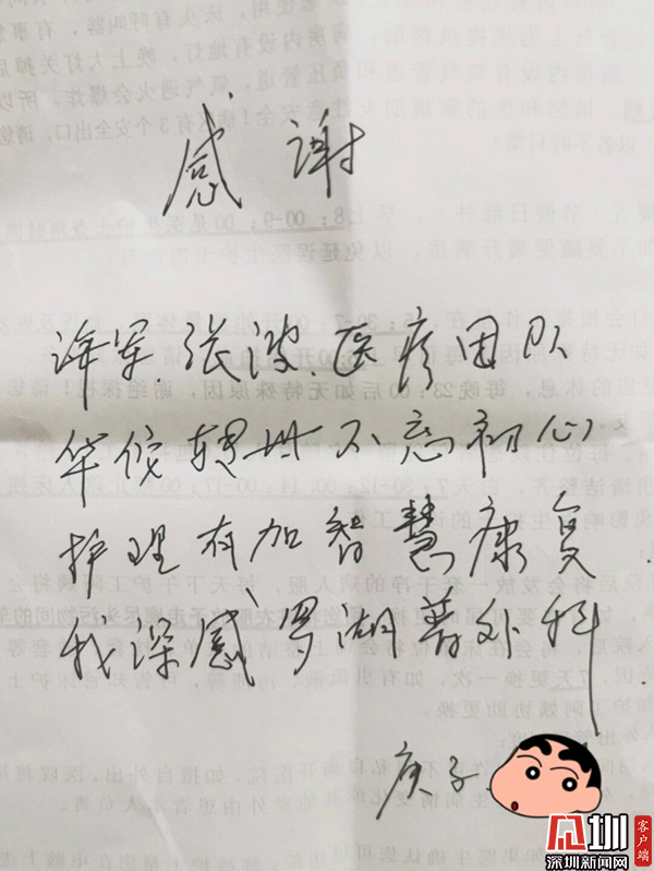 深圳新聞網(wǎng)訊(見(jiàn)圳客戶端、深圳新聞網(wǎng)記者 郭含笑 通訊員 許陽(yáng))日前,羅湖醫(yī)院普外科收到了一封來(lái)自患者的親筆感謝信,雖然用紙普通,內(nèi)容簡(jiǎn)單,但字里行間無(wú)不流露出寫信人的感激之情。