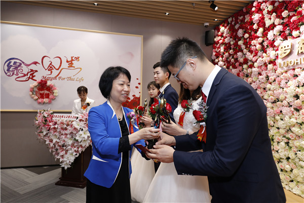 見圳客戶端·深圳新聞網(wǎng)12月12日訊(記者 李慧 通訊員 黎少忠 黃穎怡)“1212,要愛要愛!我們結(jié)婚啦!”,“雙十二”對(duì)大部分人來說是一個(gè)購物的好日子,但對(duì)打算步入婚姻的新人們來說,卻是一個(gè)不可錯(cuò)過的登記好時(shí)機(jī)。12月12日,羅湖區(qū)婚姻登記處四處洋溢著歡樂的笑聲,12對(duì)新人在滿是玫瑰花的婚姻登記處中舉行集體結(jié)婚儀式。據(jù)悉,這也是疫情以來羅湖區(qū)首場(chǎng)結(jié)婚登記集體頒證儀式。