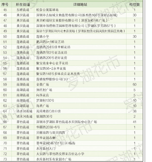 羅湖區(qū)共開設近500個花市鋪位,遍布全區(qū)10個街道,近40個社區(qū)。同時,羅湖區(qū)還特別制作了花市地圖,最大限度的方便市民就近購花。