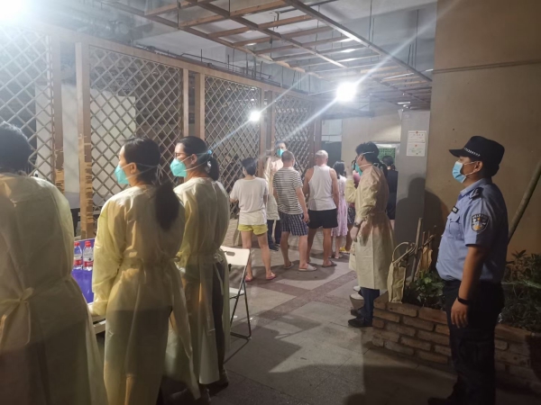 “我們已經(jīng)協(xié)調(diào)社康開始發(fā)號(hào)了,不要急,請(qǐng)耐心等待?!惫S崗社康外,一名民警正頂著烈日揮汗如雨,耐心地給居民進(jìn)行解釋,警服肩頸處可見一道道汗?jié)n。