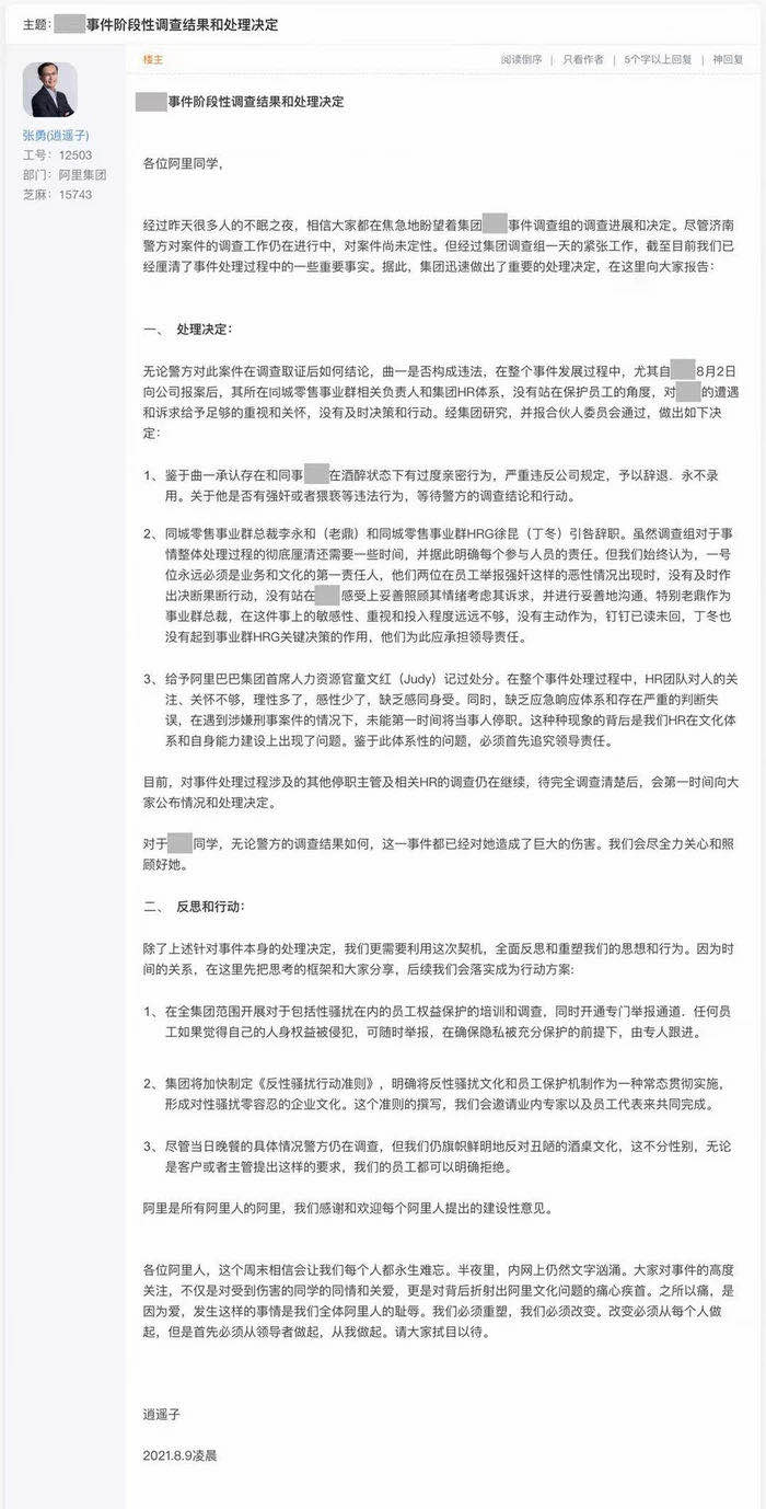 阿里張勇回應(yīng)“女員工被侵害”:震驚氣憤羞愧,必須調(diào)查清楚