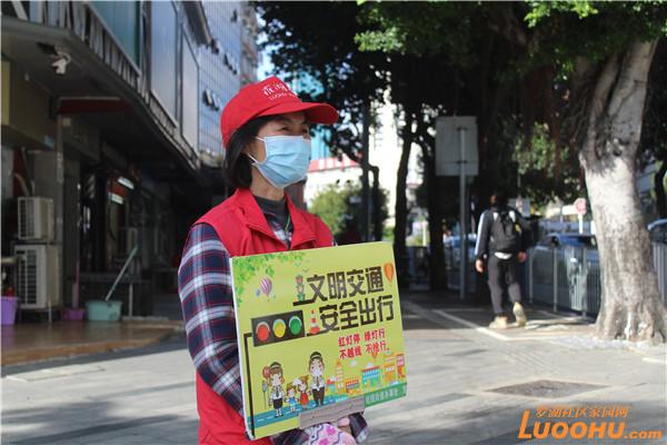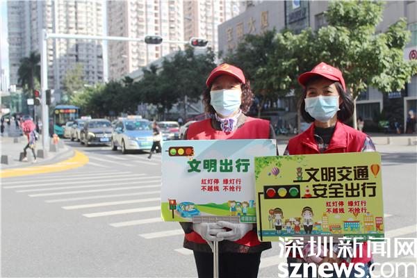 據(jù)了解,老圍社區(qū)黨委將創(chuàng)建文明城市納入常態(tài)化工作之中,黨群服務中心的社工迅速組建了創(chuàng)文小分隊,長期堅守在紅寶路和寶安南路的十字路口勸導交通。這是一條繁忙的十字路口,前有桂園小學,后有盒馬超市,左邊是京基100寫字樓,右邊是地王大廈,周圍都是居民住宅小區(qū),每天車水馬龍,行人如織。尤其上班早高峰,路口更是熙來攘往川流不息。志愿者們守在路口,全神貫注,時刻留意那些準備闖紅燈的騎行者,不走斑馬線的行人,勸導他們遵守交通規(guī)則,保障正常的交通秩序。