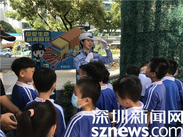 結(jié)束警營(yíng)的參觀,羅湖交警組織學(xué)生們前往東門社區(qū)交通安全主題公園開(kāi)展交通安全教育。在民警的引導(dǎo)下,同學(xué)們被趣味游戲所吸引,在模擬機(jī)動(dòng)車道玩起了“交通安全齊步走”,在交通標(biāo)識(shí)轉(zhuǎn)轉(zhuǎn)墻前認(rèn)識(shí)各類交通標(biāo)識(shí),在大車盲區(qū)警示等設(shè)施裝置中進(jìn)行沉浸式體驗(yàn)。