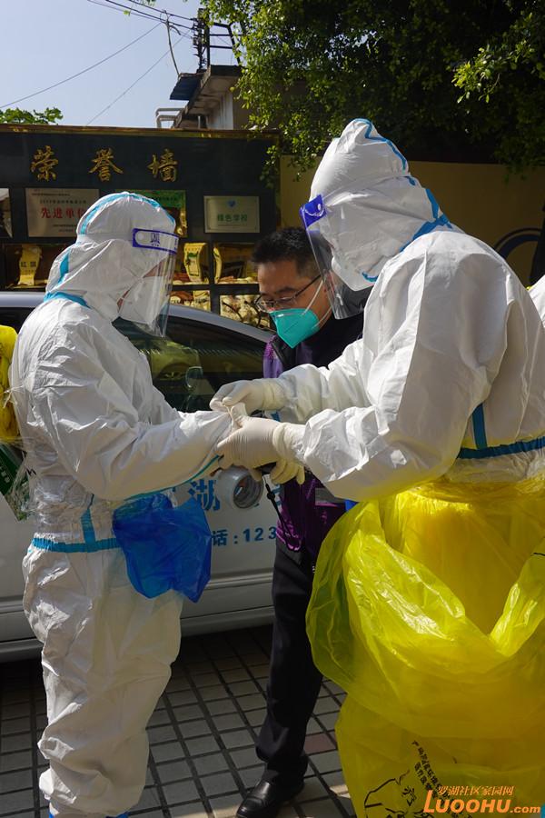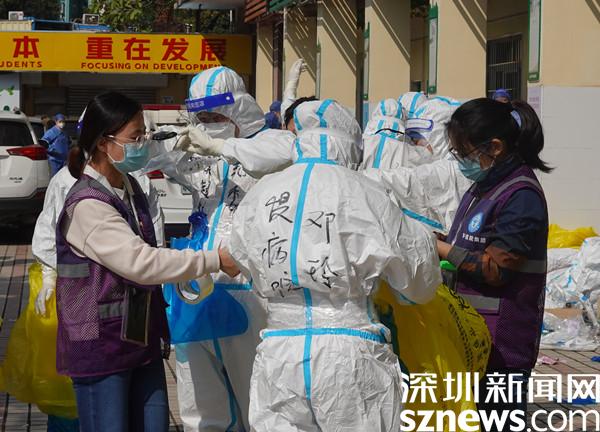臘八節(jié)剛過(guò),深圳帶著些許涼意,卻也是艷陽(yáng)高照?!巴緜?,相互檢查一下手腕腳腕有沒(méi)有貼好!穿戴整齊后準(zhǔn)備集結(jié)出發(fā)啦!”在封控區(qū)外圍的醫(yī)護(hù)人員整備區(qū),一群身穿防護(hù)服、全副“武”裝的工作人員整裝待發(fā),兩人一組,目光堅(jiān)定,向著封控區(qū)的入口走去。