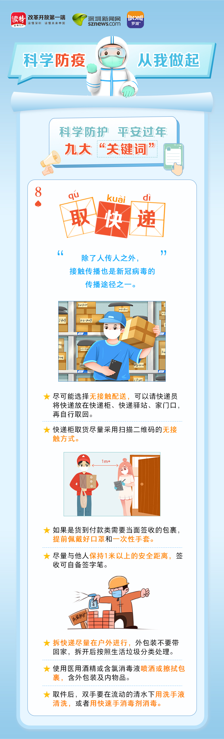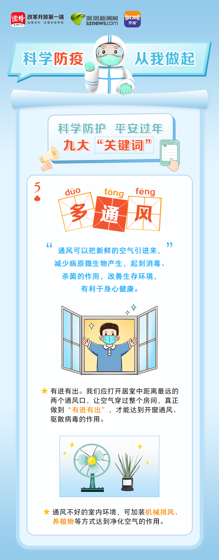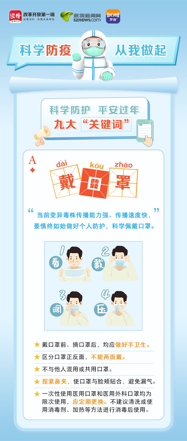 為更好地保護(hù)自己和他人的健康,度過一個(gè)祥和平安的春節(jié),請(qǐng)查收《科學(xué)防護(hù)平安過年九大“關(guān)鍵詞”》。在這場(chǎng)沒有硝煙的戰(zhàn)斗中,公安干警、醫(yī)護(hù)人員、社區(qū)工作者、志愿者始終堅(jiān)守在一線,齊心協(xié)力、眾志成城抗擊疫情。讓我們攜手并進(jìn),共同抗疫,采用科學(xué)有效的方式做好自身防護(hù),不僅對(duì)自己負(fù)責(zé),更是對(duì)家人負(fù)責(zé),對(duì)社會(huì)負(fù)責(zé)。