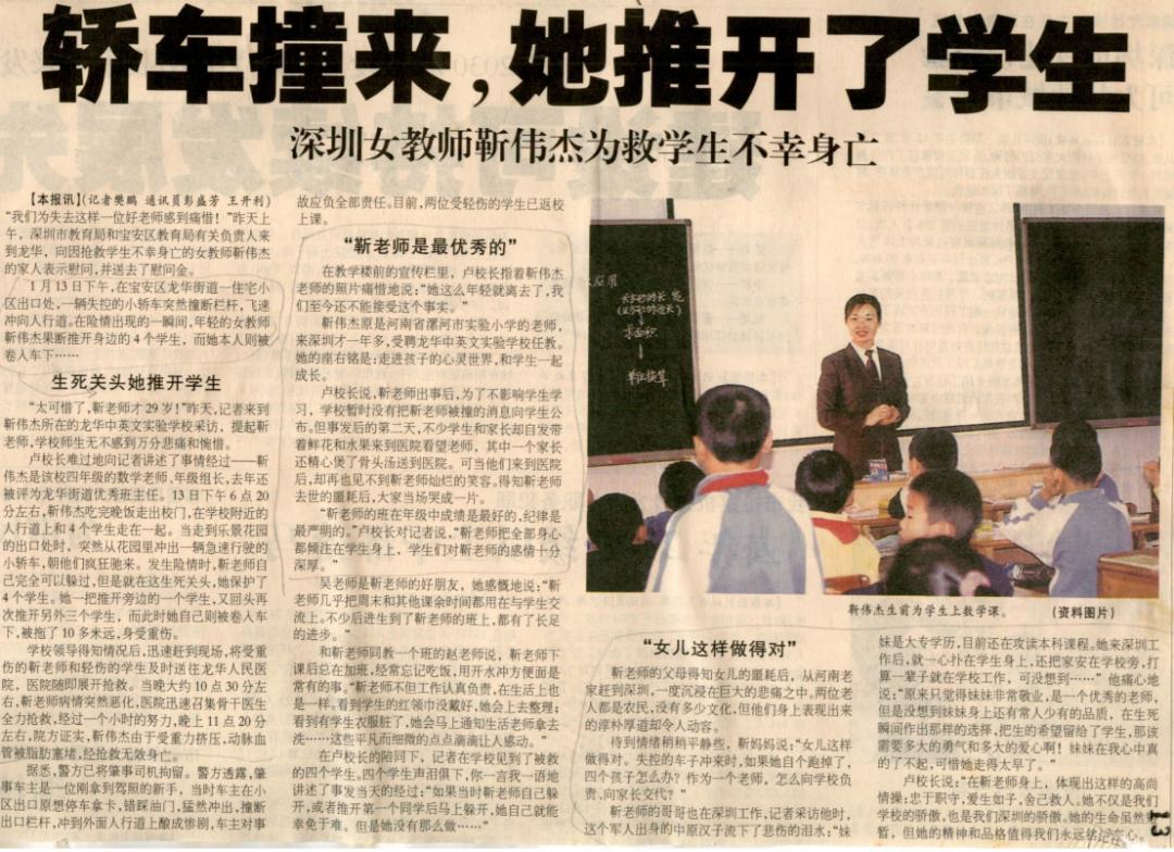 當(dāng)失控的汽車(chē)沖向她和4名學(xué)生時(shí),年僅29歲的龍華中英文學(xué)校女教師靳偉杰把生的希望留給了學(xué)生,自己卻獻(xiàn)出了生命。