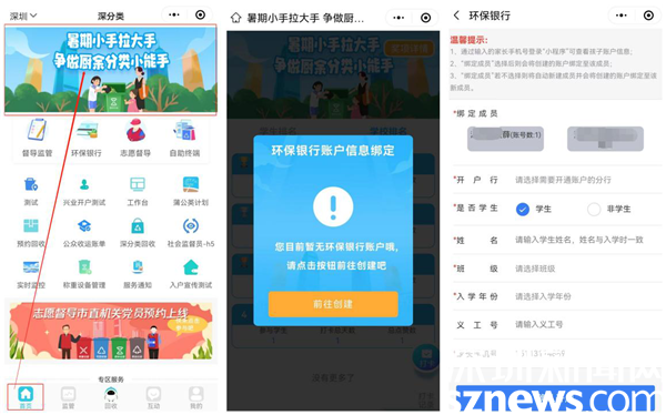 學(xué)生及家長可通過“深分類”小程序首頁主題活動入口進入活動。在參與活動之前,學(xué)生所在學(xué)校需開通環(huán)保銀行支行,學(xué)生需注冊所在學(xué)校支行的環(huán)保銀行賬戶,并在活動中進行賬戶信息綁定、上傳參與學(xué)生照片才可參與后續(xù)打卡集贊活動。