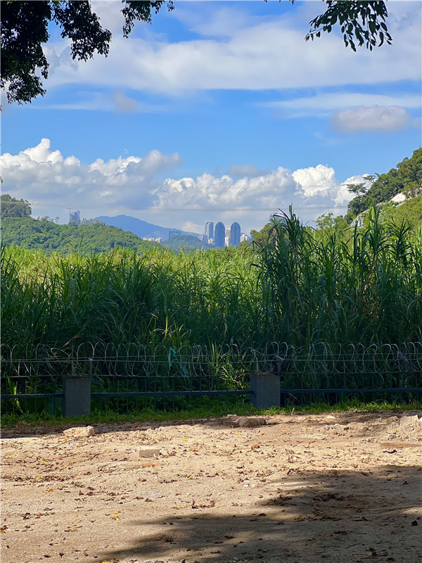 陽(yáng)光炙烤著大地,綠樹(shù)環(huán)繞成蔭,近處是生機(jī)盎然的灌木叢,遠(yuǎn)處是一派城市光景,別有趣味。