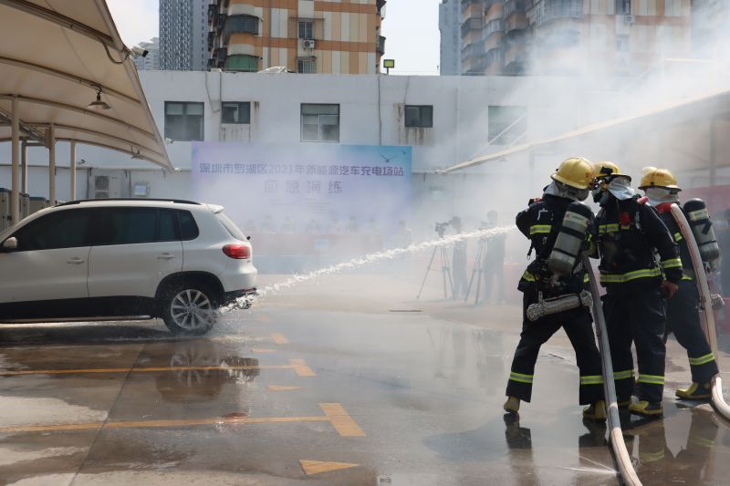 2021年9月15日上午,深圳市羅湖區(qū)發(fā)展和改革局在喜立快充充電站組織開展2021年新能源汽車充電場站應急演練,區(qū)應急管理局、東曉街道辦、羅湖區(qū)消防救援大隊等23個職能部門相關負責人和羅湖區(qū)新能源汽車充電樁運營企業(yè)負責人進行了參演和現場觀摩。