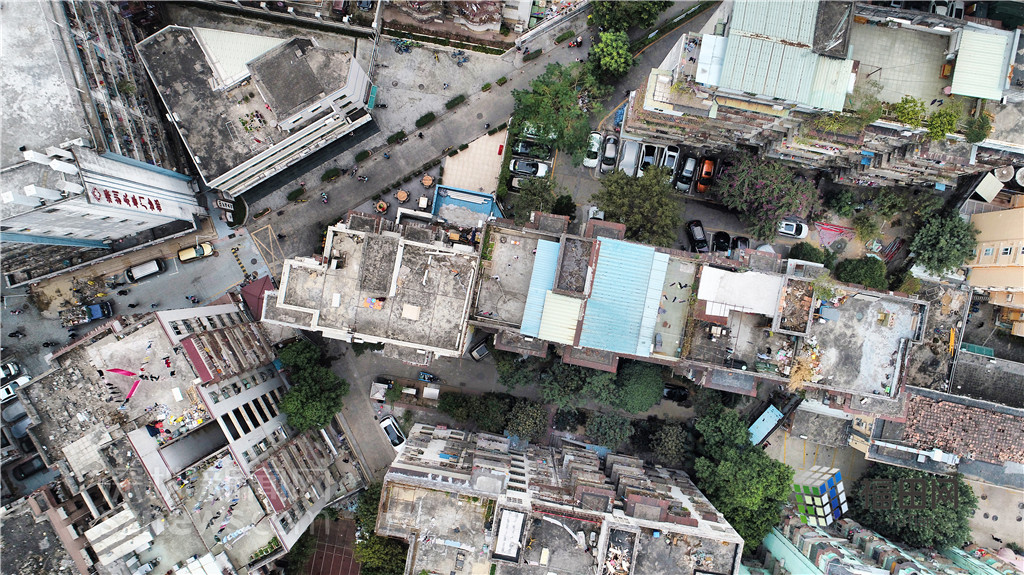 從無(wú)人機(jī)視野中,村內(nèi)房屋雖然擁擠,但綠化很好。