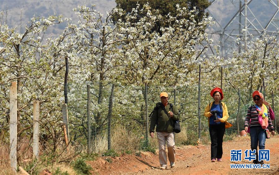 這是幾名游客在云南昆明呈貢萬(wàn)溪沖的梨園里(3月21日攝)。近期以來(lái),云南多地的梨花相繼開(kāi)放。梨花、村莊、民居、游人相映成趣,構(gòu)成了一幅幅美麗的“大地春歌”圖。新華社記者 藺以光攝