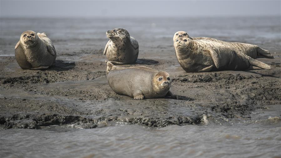 3月25日,幾只斑海豹在遼寧盤錦雙臺河口三道溝海域的灘涂上休息。新華社記者潘昱龍攝