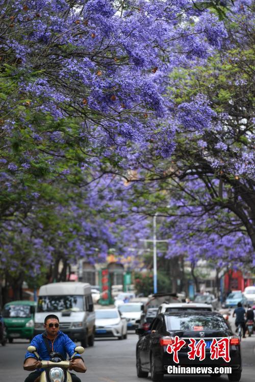 5月2日,昆明市區(qū)一道路兩旁的藍(lán)花楹盛開(kāi),車(chē)輛在“花街”穿行。 中新社記者 任東 攝