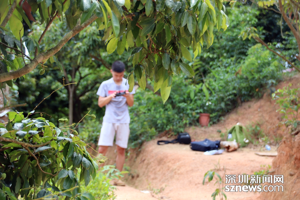 深圳新聞網(wǎng)記者正在操作無(wú)人機(jī)對(duì)羊臺(tái)山兩棟拆除后的違法建筑廢墟進(jìn)行拍攝