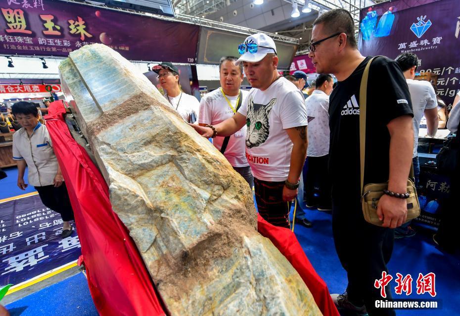 6月15日,第十一屆新疆觀賞石、和田玉精品博覽會在位于新疆烏魯木齊市紅光山的新疆國際會展中心開幕,本次博覽會參展種類涵蓋珠寶、玉石、礦石、隕石、觀賞石等,吸引眾多奇石玩家到場“以石會友”,打造獨(dú)具特色的“品石”盛宴。圖為產(chǎn)自新疆阿勒泰地區(qū)富蘊(yùn)縣庫瑪拉山重量近1噸、價值1.5億元人民幣的海藍(lán)寶原礦石。中新社記者劉新 攝