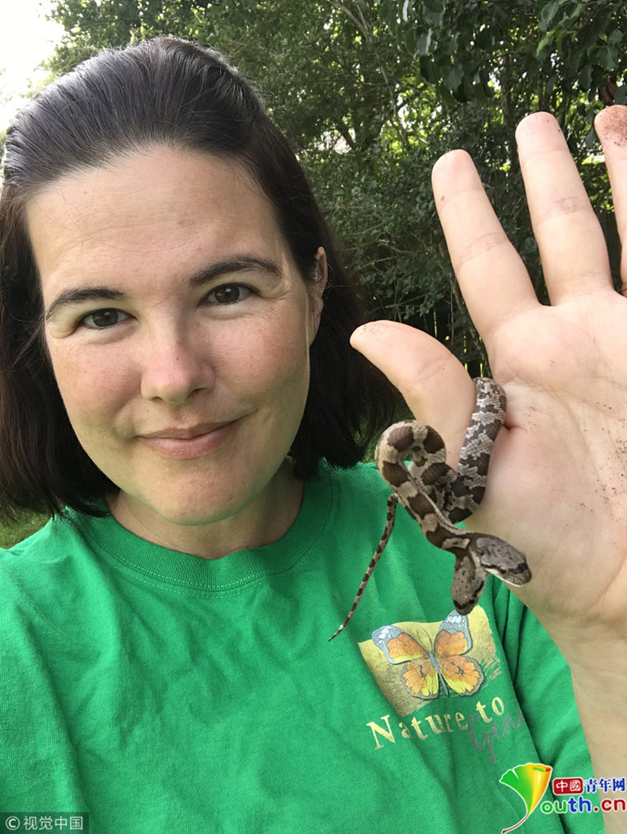 野生動(dòng)物專家Tanee Janusz收養(yǎng)了同事在后院發(fā)現(xiàn)的一只雙頭錦蛇。圖片來(lái)源:視覺(jué)中國(guó)