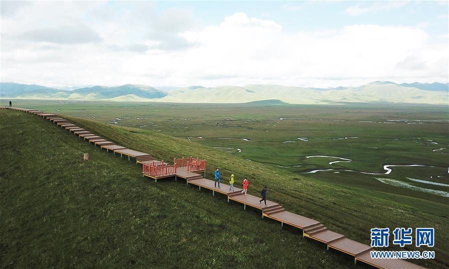 游客在瑪曲縣阿萬倉濕地的觀景步道上游覽(7月31日無人機拍攝)。 新華社記者 陳斌 攝