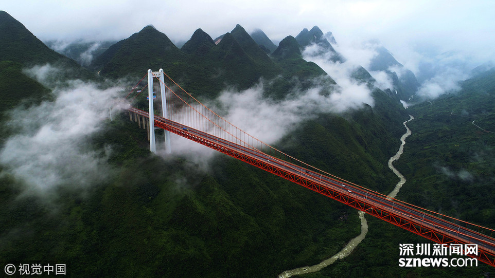 2018年6月26日,一場大雨后貴州省安順市關(guān)嶺縣壩陵河大峽谷云霧繚繞,橫跨兩岸的壩陵河大橋在云霧中時(shí)隱時(shí)現(xiàn),更顯雄偉壯觀。