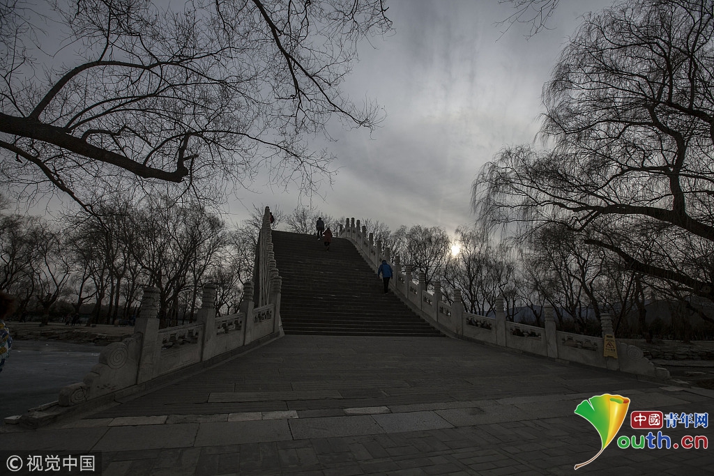 2018年2月23日,北京頤和園。當(dāng)天日落時(shí)分昆明湖上空出現(xiàn)夕陽(yáng)余暉的美景,夢(mèng)幻般的色彩將古老的皇家園林裝扮得美輪美奐,讓人流連忘返。來(lái)源:視覺(jué)中國(guó)