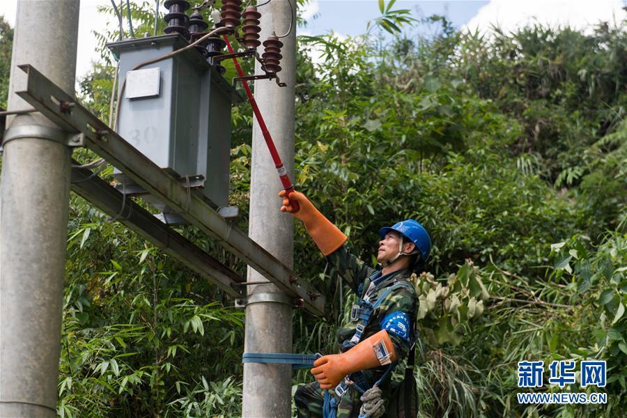 9月5日,麻栗坡縣供電局的工作人員搶修受損電力設(shè)備。