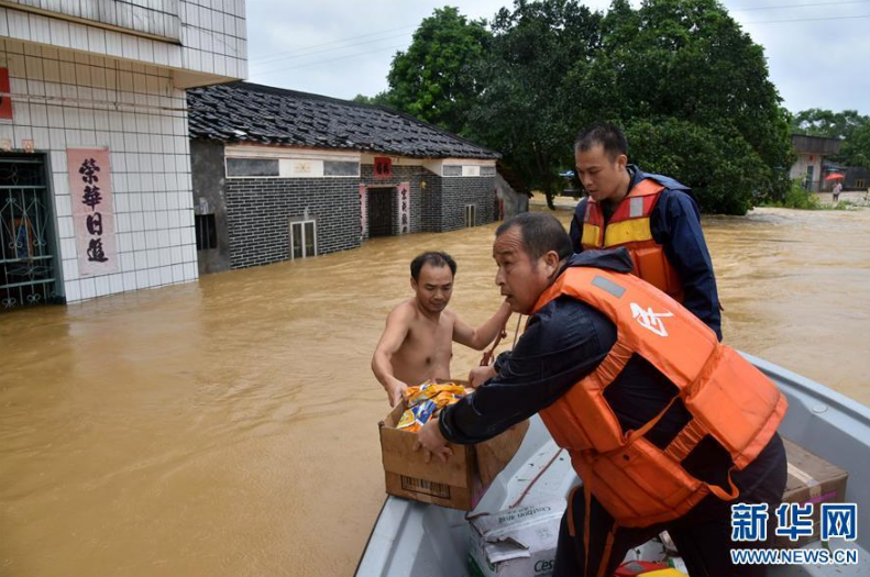 9月18日,在廣東省陽江市陽春市,人們把食物搬運(yùn)到筏子上,準(zhǔn)備分發(fā)給受困村民。 新華社記者張加揚(yáng)攝