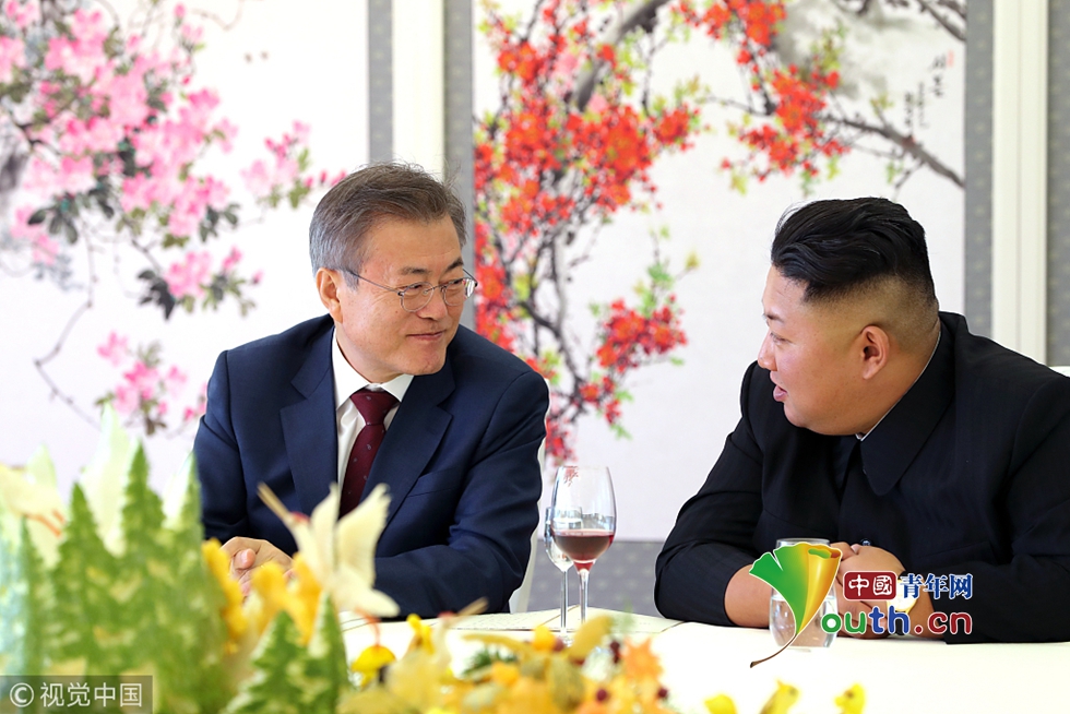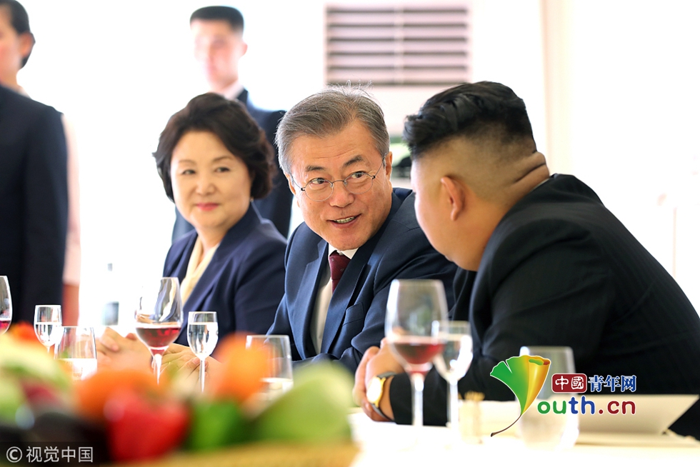 當(dāng)?shù)貢r(shí)間2018年9月20日,朝鮮,韓國總統(tǒng)文在寅在三池淵招待所和金正恩夫婦一起共進(jìn)午餐。圖片作者:Yonhap News Agency/視覺中國
