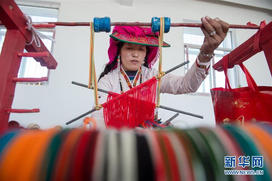 員工卓瑪在鹽湖鄉(xiāng)羌麥村民族手工編織廠工作(9月19日攝)。 2018年,西藏阿里地區(qū)革吉縣鹽湖鄉(xiāng)政府自籌資金成立羌麥村民族手工編織廠,編織廠將當(dāng)?shù)貍鹘y(tǒng)手工編織技藝與市場需求相結(jié)合,生產(chǎn)手提包、圍脖、腰帶、毛毯、藏式頭巾等產(chǎn)品,并參加旅游推介活動(dòng),拓寬編織品銷售渠道,助力當(dāng)?shù)鼐用衩撠殹?新華社記者 劉東君 攝