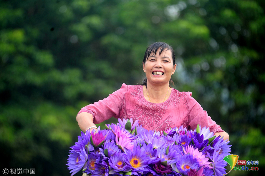 2018年9月23日,廣西柳州,柳北區(qū)石碑坪鎮(zhèn)下陶村的農(nóng)民覃向鮮采摘的九品香蓮,臉上露出豐收的喜悅。圖片作者:陳健明