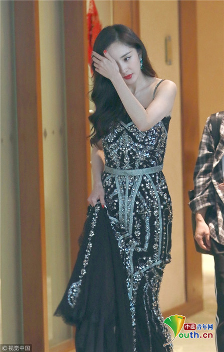 楊冪卷發(fā)成熟美露香肩 自提裙擺過酒店大堂