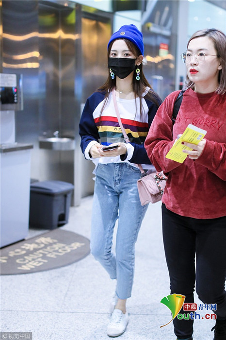 2018年9月25日,北京,“錦鯉少女”楊超越現(xiàn)身機場,她身穿“彩虹裝”青春無敵,戴著糖果色耳環(huán),細節(jié)處可愛吸睛。