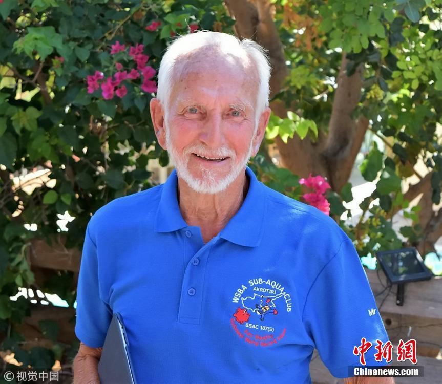 當(dāng)?shù)貢r(shí)間2018年9月1日,塞浦路斯,95歲的英國(guó)潛水員雷·伍利(Ray Woolley)以44分鐘下潛40.5米的成績(jī)打破了自己94歲達(dá)成的記錄(41分鐘下潛38.1米),二度刷新了世界上年齡最大的男性潛水員最好成績(jī)。在此次下潛中,這位二戰(zhàn)退伍老兵對(duì)距塞浦路斯南部城鎮(zhèn)拉納卡約2公里處的海域進(jìn)行了探索,1980年一艘名為“芝諾比亞號(hào)”(Zenobia)的貨船在這里進(jìn)行首次航行時(shí)沉沒(méi)。圖片來(lái)源:視覺(jué)中國(guó)