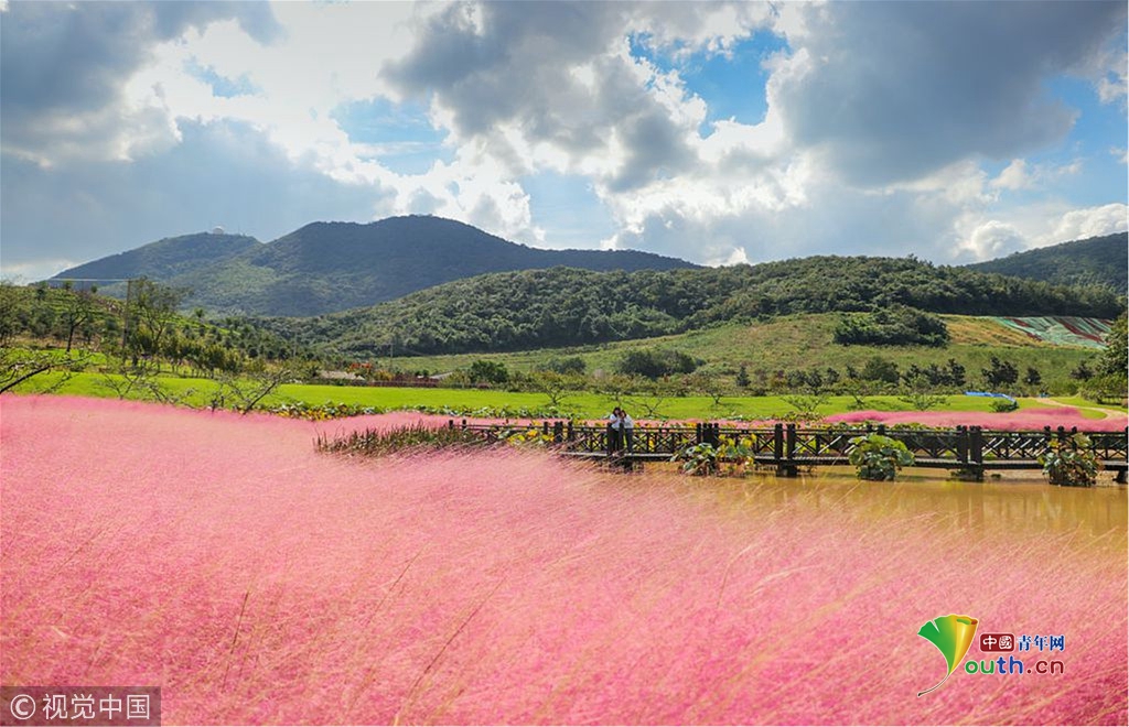 當游客來到這里,立刻被眼前的一片浪漫的粉色所吸引。只見半人高的粉黛亂子草,縹緲如輕煙,搖曳似夢幻,伴著微風掀起了一陣陣的波浪。