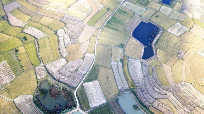 9月28日,人們?cè)跐h中市漢江濕地公園游覽(無人機(jī)拍攝)。