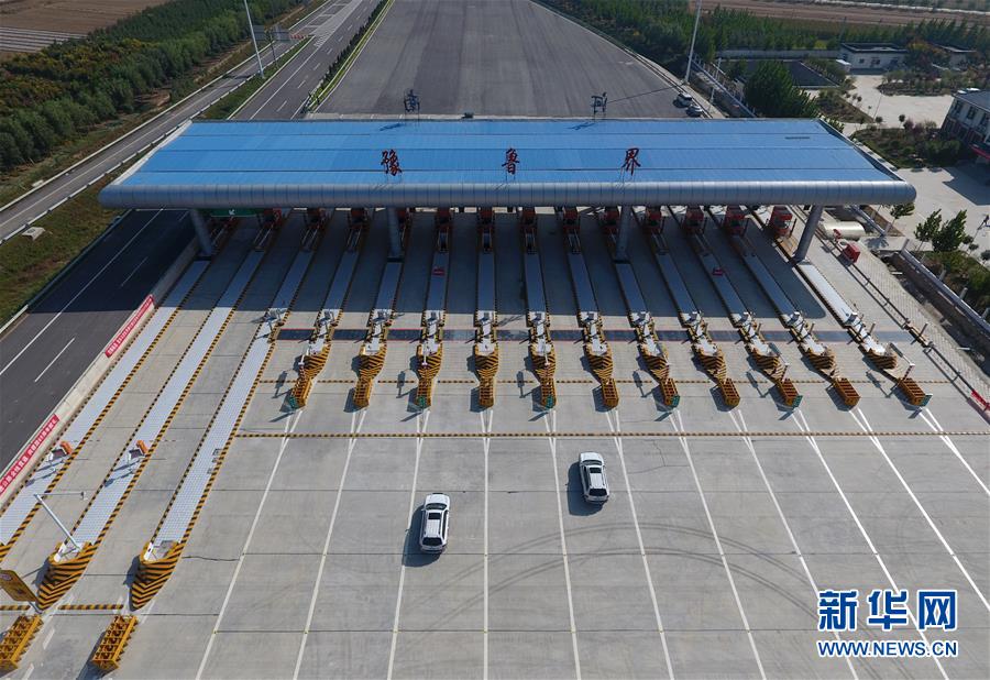 9月28日,車輛準(zhǔn)備通過河南省南樂縣的南(樂)林(州)高速豫魯界收費站(無人機(jī)拍攝)。新華社記者 馮大鵬 攝