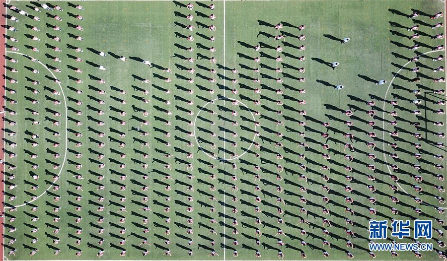 在小崗村小崗學(xué)校,學(xué)生們在體育展示課上做操(9月27日無人機拍攝)。 新華社記者 才揚攝