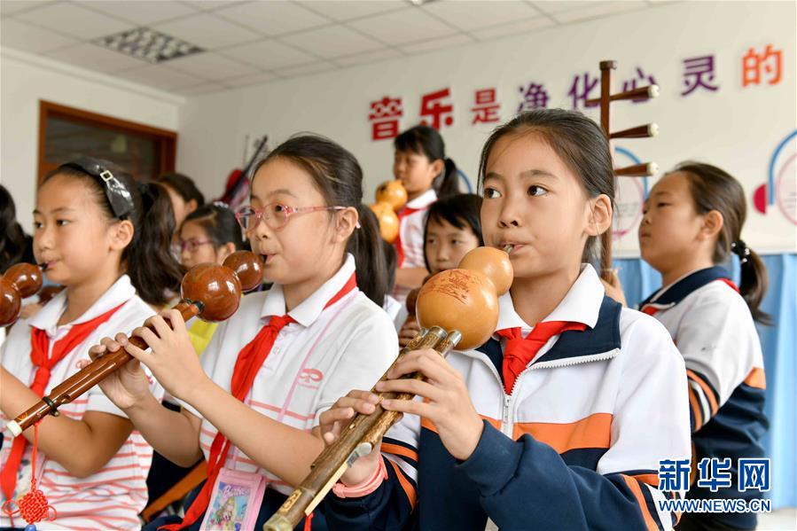 9月29日,在威海市經(jīng)濟技術(shù)開發(fā)區(qū)新都小學(xué),學(xué)生們吹奏葫蘆絲。新華社記者郭緒雷攝