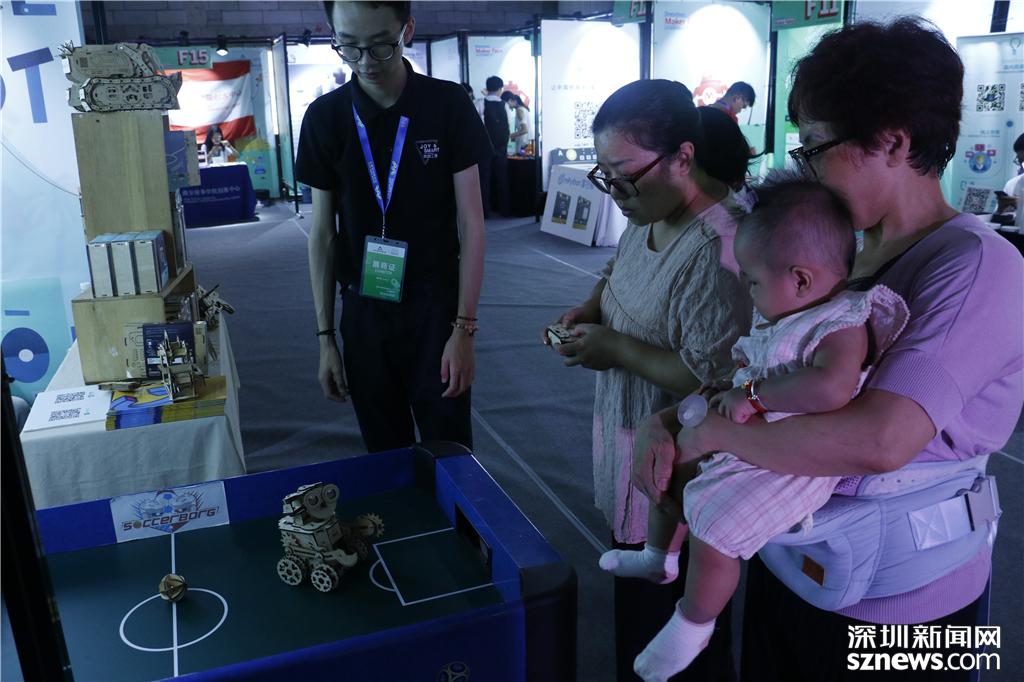 F16玩創(chuàng)工房展位前,市民體驗(yàn)操作機(jī)器人