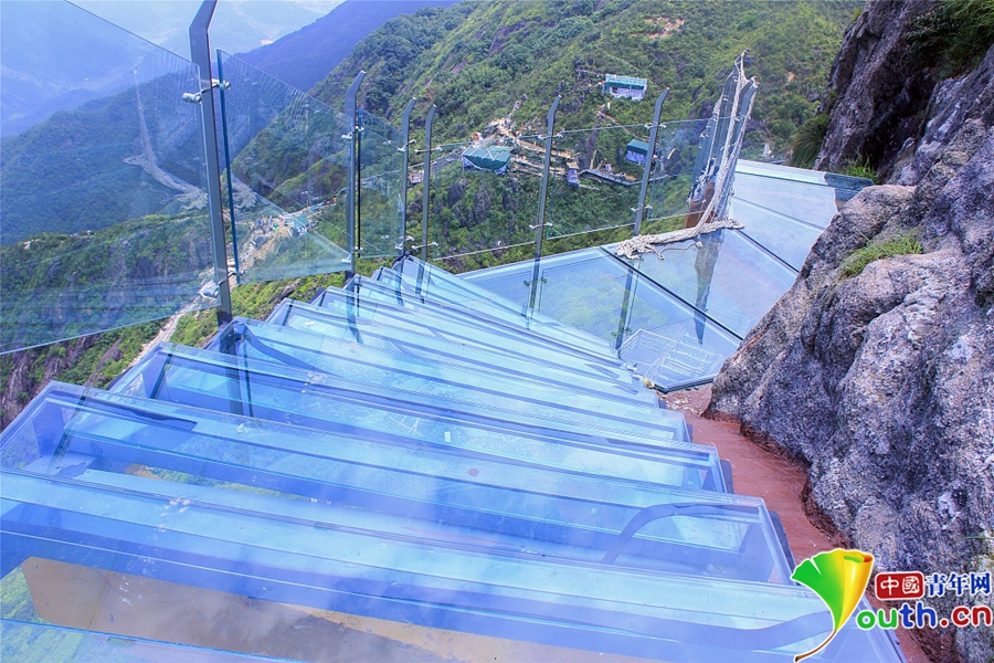 2018年8月,廣東清遠(yuǎn)。如今,玻璃橋、玻璃觀景臺、玻璃漂流道、玻璃滑道等玻璃產(chǎn)品可以說多如牛毛,琳瑯滿目。這些玻璃產(chǎn)品都是水平的,即使有坡度,也是借助工具滑下去的。小伙伴們是否挑戰(zhàn)體驗過像樓梯一樣的玻璃天梯,階梯式攀向高處,直聳云宵,云霧飄渺。