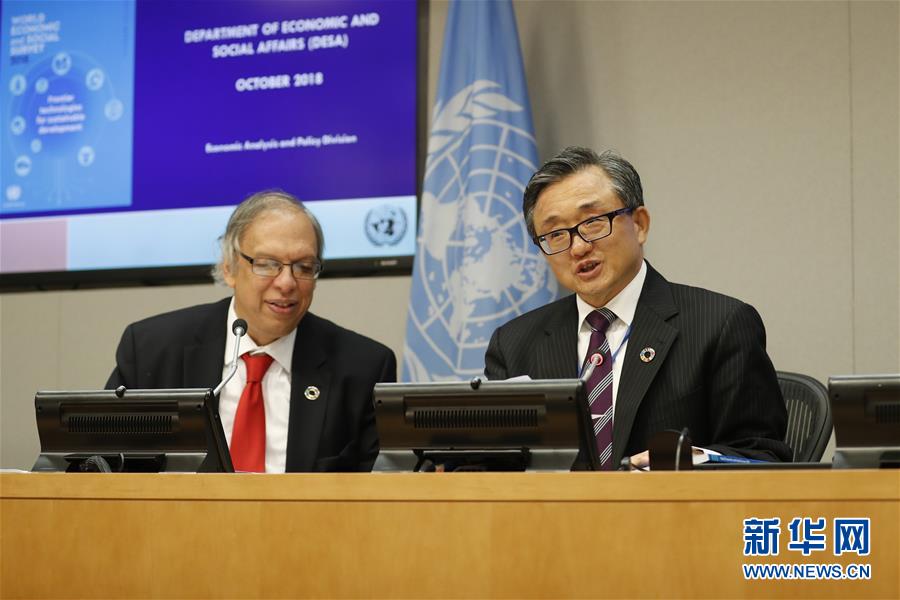 10月8日,在位于紐約的聯(lián)合國總部,聯(lián)合國負責(zé)經(jīng)濟和社會事務(wù)的副秘書長劉振民(右)向記者介紹《2018年世界經(jīng)濟和社會概覽》。 新華社記者李木子攝