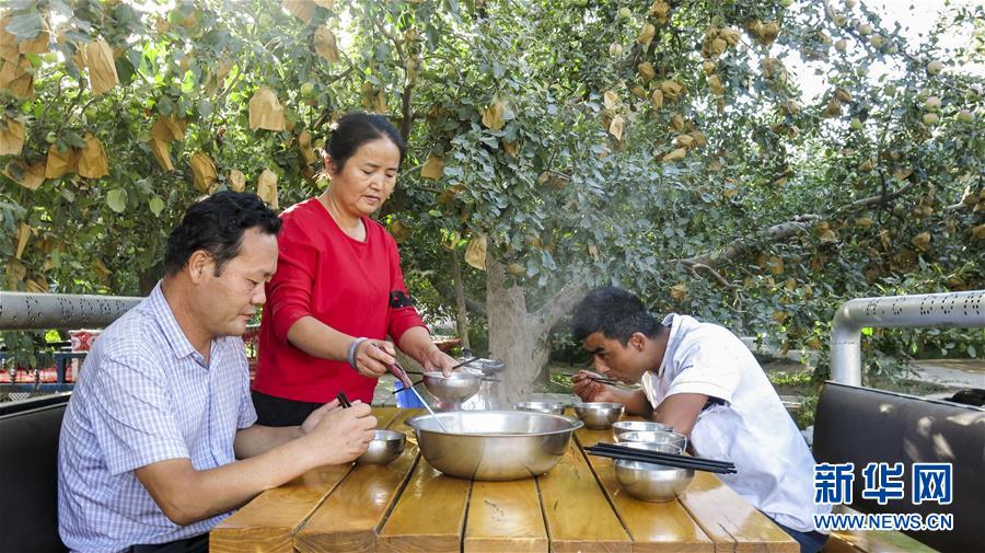 甘永軍(左一)在地處新疆阿克蘇地區(qū)柯柯牙綠化工程內(nèi)的果園吃飯(2017年9月22日攝)。10年前,甘永軍還在果園開起了第一個農(nóng)家樂,帶動周邊100多戶果農(nóng)經(jīng)營起了自家庭院。 在世界第二大流動性沙漠——塔克拉瑪干沙漠西北邊,一條逾百萬畝的人工林帶傲然挺立。 這條林帶就是柯柯牙荒漠綠化工程。它是新疆阿克蘇黃沙漫漫和碧波萬頃的分界嶺。 1986年,為改變惡劣的自然條件,阿克蘇啟動柯柯牙綠化工程。30年間,各族干部群眾攜手奮斗,曾是沙塵暴策源地的柯柯牙綠樹成蔭;并以此為原點,在南疆戈壁荒灘上孕育出百萬畝的“綠海”。 30多年來,阿克蘇打造出“人走政不息”的樣本,使綠色發(fā)展理念成為幾代人的廣泛共識;“自力更生、艱苦奮斗、無私奉獻”的柯柯牙精神,已融入各族兒女血液中;“以林養(yǎng)林”“邊綠化邊脫貧”的綠化、脫貧方式,給其他荒漠地區(qū)貢獻了“柯柯牙智慧”。 新華社記者 杜剛 攝