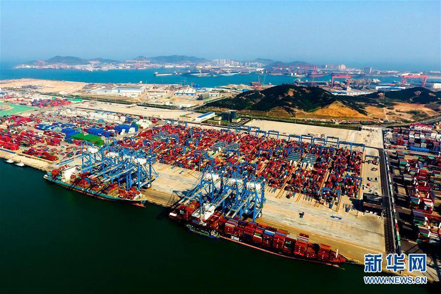 2018年5月4日無(wú)人機(jī)拍攝的青島港前灣自動(dòng)化集裝箱碼頭。