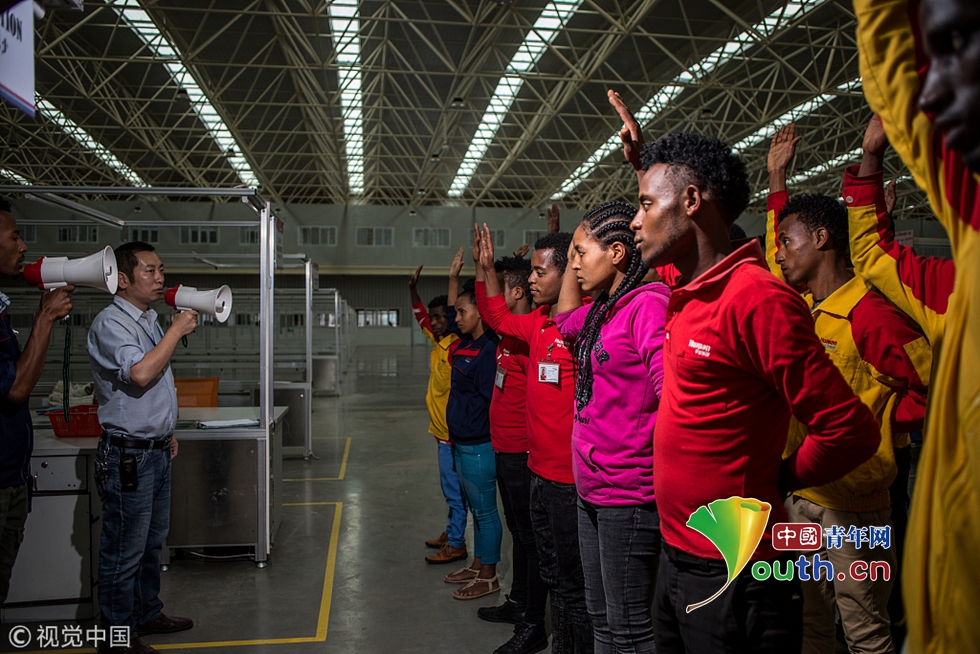 7月31日,埃塞俄比亞首都亞的斯亞貝巴的一家中國(guó)民營(yíng)制鞋工廠——華堅(jiān)鞋廠,下午的工作開始前,當(dāng)?shù)毓蛦T用中文喊著“一二三四”列隊(duì)集合,合唱廠歌。