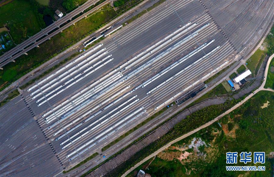 這是廣西南寧動(dòng)車所內(nèi)準(zhǔn)備發(fā)往各地的動(dòng)車組列車(7月1日無(wú)人機(jī)拍攝)。 廣西壯族自治區(qū)成立60年來(lái),鐵路建設(shè)發(fā)生翻天覆地的變化。來(lái)自中國(guó)鐵路南寧局集團(tuán)有限公司的數(shù)據(jù)顯示,1958年廣西鐵路總里程為1346.3公里,如今廣西鐵路總里程達(dá)5191公里。廣西與周邊相鄰省份間實(shí)現(xiàn)動(dòng)車“公交化”開行。此外,北部灣港—重慶班列、東盟海產(chǎn)品冷鏈班列、“百色一號(hào)”果蔬專列等的開通和運(yùn)營(yíng),強(qiáng)化了鐵路供給的針對(duì)性和有效性。鐵路成為助推廣西經(jīng)濟(jì)社會(huì)快速發(fā)展的“大動(dòng)脈”。 新華社記者黃孝邦攝