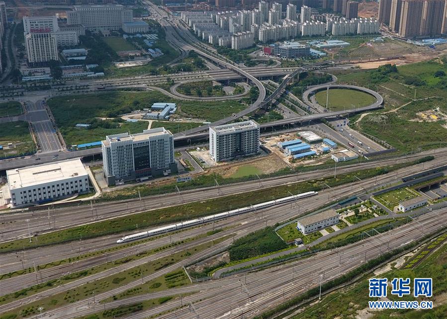 一列動(dòng)車在南寧市區(qū)行駛(9月4日無人機(jī)拍攝)。 廣西壯族自治區(qū)成立60年來,鐵路建設(shè)發(fā)生翻天覆地的變化。來自中國鐵路南寧局集團(tuán)有限公司的數(shù)據(jù)顯示,1958年廣西鐵路總里程為1346.3公里,如今廣西鐵路總里程達(dá)5191公里。廣西與周邊相鄰省份間實(shí)現(xiàn)動(dòng)車“公交化”開行。此外,北部灣港—重慶班列、東盟海產(chǎn)品冷鏈班列、“百色一號(hào)”果蔬專列等的開通和運(yùn)營,強(qiáng)化了鐵路供給的針對(duì)性和有效性。鐵路成為助推廣西經(jīng)濟(jì)社會(huì)快速發(fā)展的“大動(dòng)脈”。 新華社記者陸波岸攝