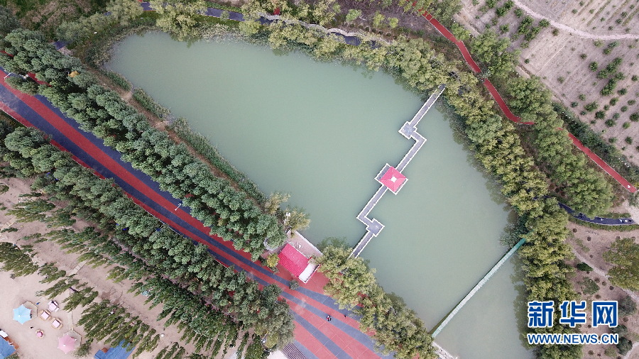 俯瞰恩格貝月亮湖。(新華網(wǎng) 王宇 攝)