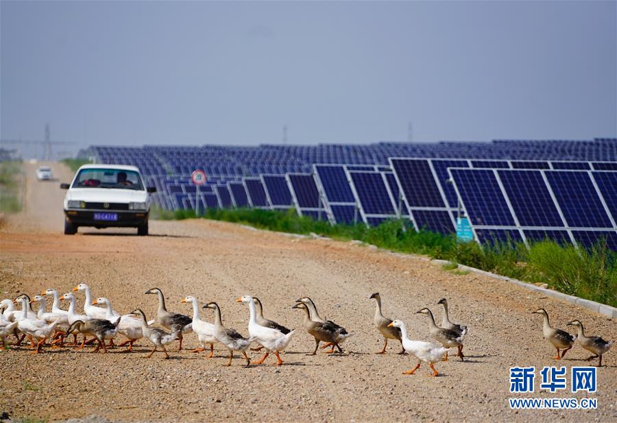 這是內蒙古鄂爾多斯市杭錦旗庫布其沙漠生態(tài)太陽能光伏光熱治沙發(fā)電綜合示范地(8月1日攝)?!鞍迳习l(fā)電、板下種草、板間養(yǎng)殖”,目前該太陽能發(fā)電項目治沙面積達到了13.3平方公里,每年發(fā)電5億千瓦時,實現(xiàn)銷售收入4.5億元。其社會效益、生態(tài)效益、民生效益、經(jīng)濟效益十分顯著。